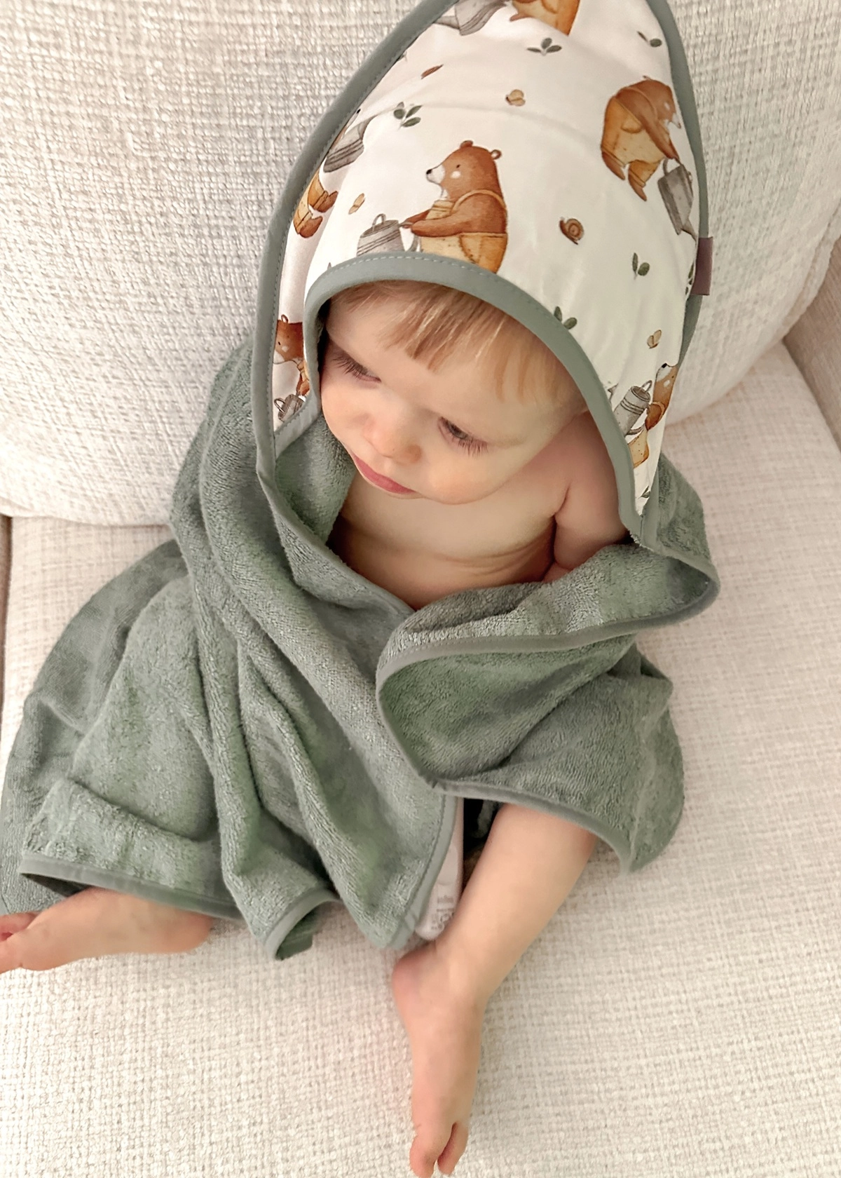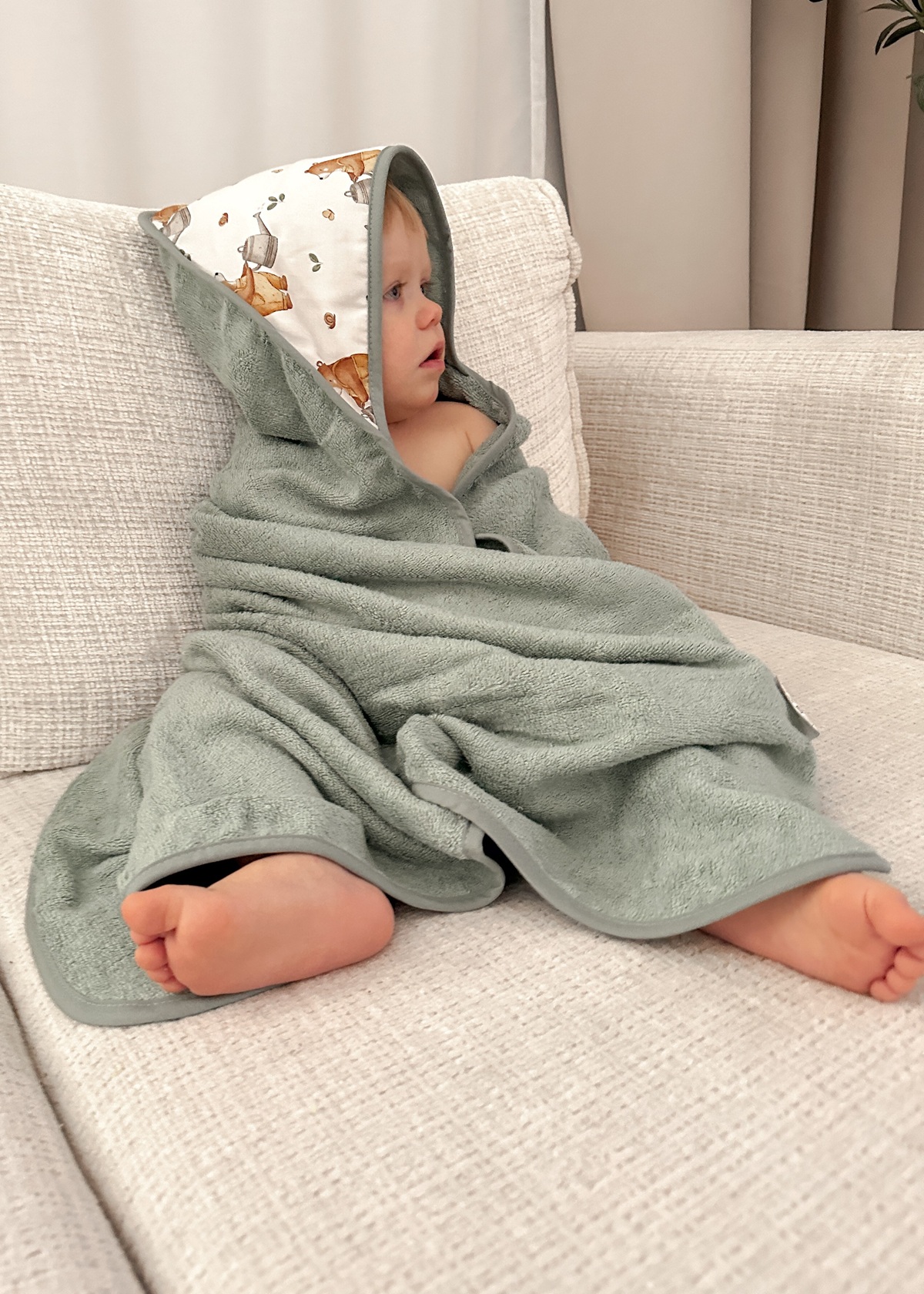 Kapturek okrywający głowę doskonale wchłania wodę, dokładnie osuszając delikatną skórę dziecka.