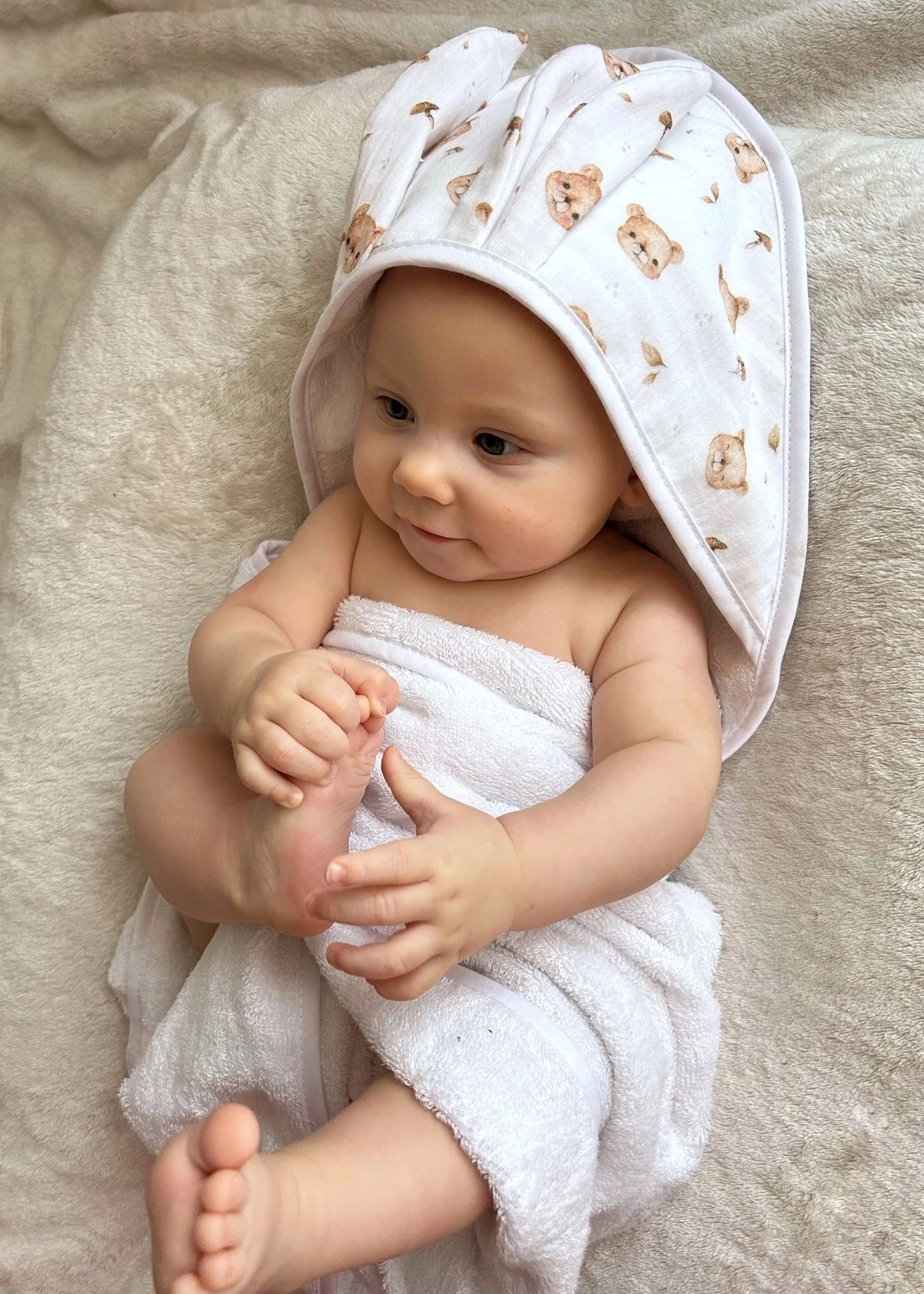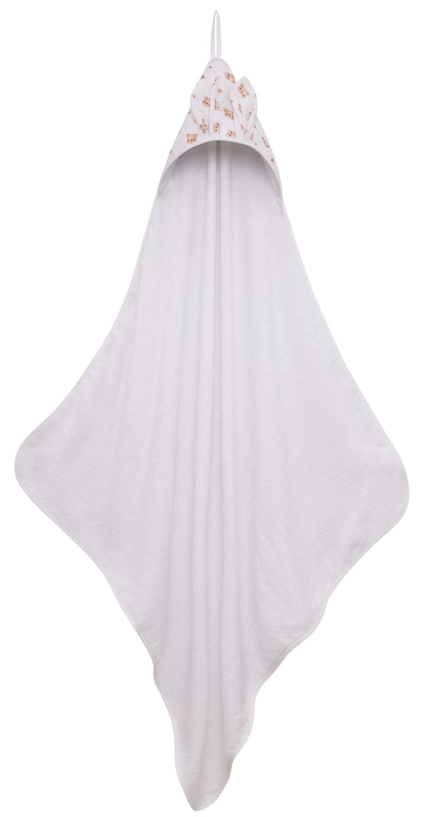 Kapturek okrywający głowę doskonale wchłania wodę, dokładnie osuszając delikatną skórę dziecka.