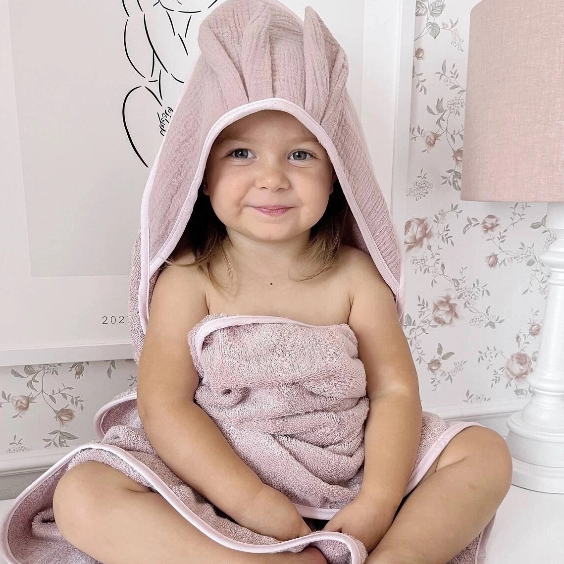 Okrycie kąpielowe uszyte z grubej i mięsistej tkaniny bambusowej i bawełny. Posiada muślinowy kapturek wykończony dekoracyjnymi uszkami.