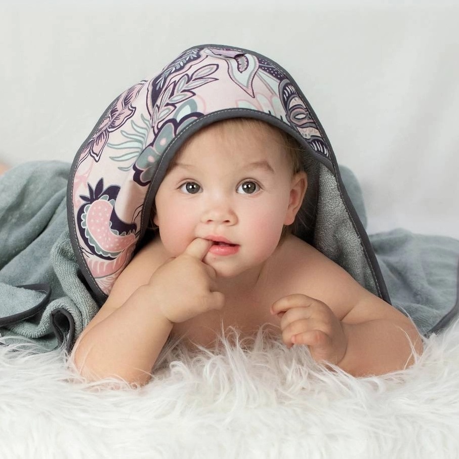 Kapturek okrywający głowę doskonale wchłania wodę, dokładnie osuszając delikatną skórę dziecka.