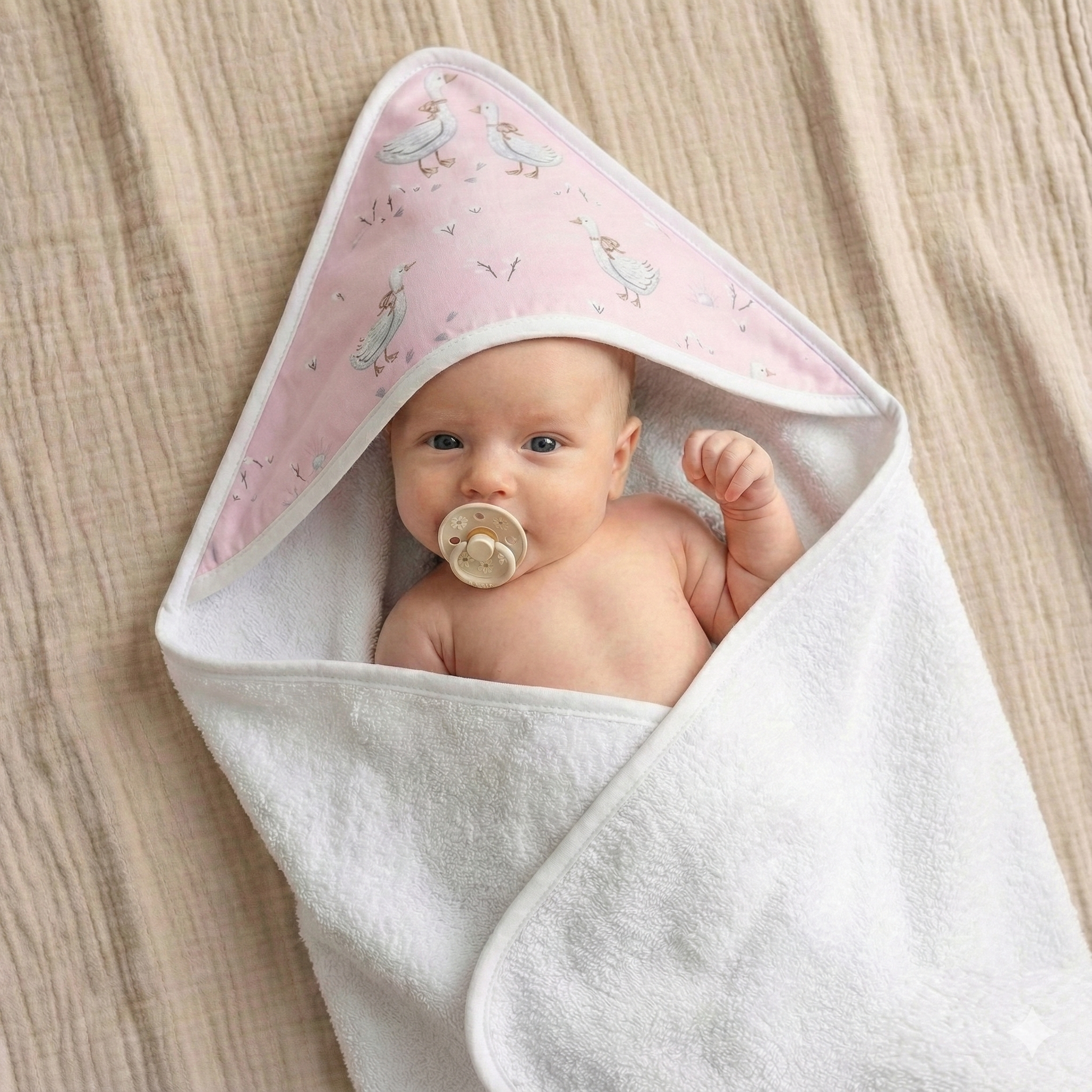 Ciepłe i miękkie okrycie kąpielowe dla niemowląt, wykonane z wysokiej jakości dzianiny frotte ze 100% bawełny. Idealnie sprawdzi się do otulenia dziecka bezpośrednio po kąpieli, zapewniając mu komfort, ciepło i poczucie bezpieczeństwa już od pierwszych chwil życia.