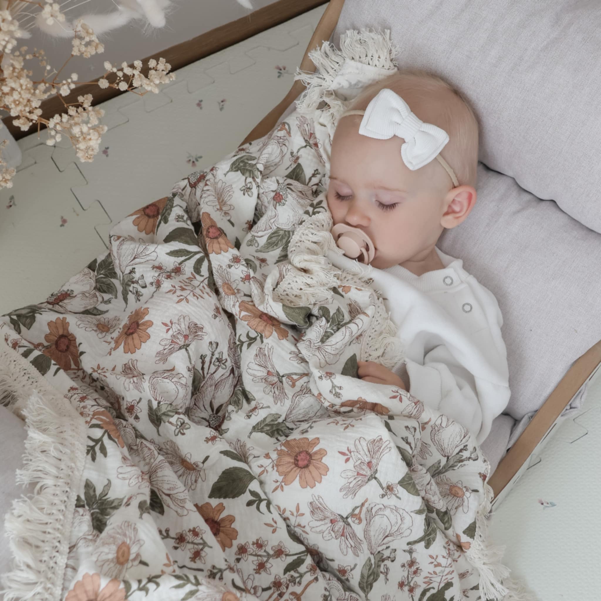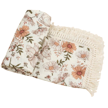 Otulacz muślinowy Retro Kwiaty z frędzlami 120×100 cm NS