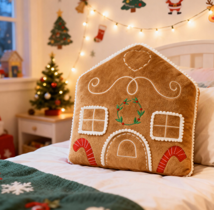 Urocza poduszka w kształcie świątecznego domku wykonana z miękkiego, przyjemnego w dotyku weluru to idealny dodatek do zimowych aranżacji. Jej subtelny blask, staranne wykończenie i wyjątkowy kształt tworzą ciepły, magiczny klimat, który doskonale wpisuje się w dekoracje bożonarodzeniowe.