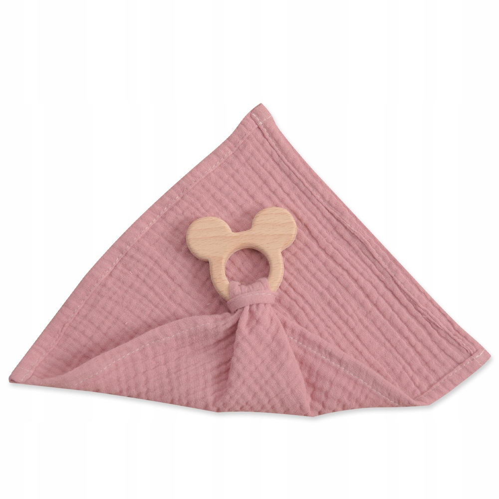 Przytulanka muślinowa uspokajacz z drewnianą zawieszką pudrowy BR