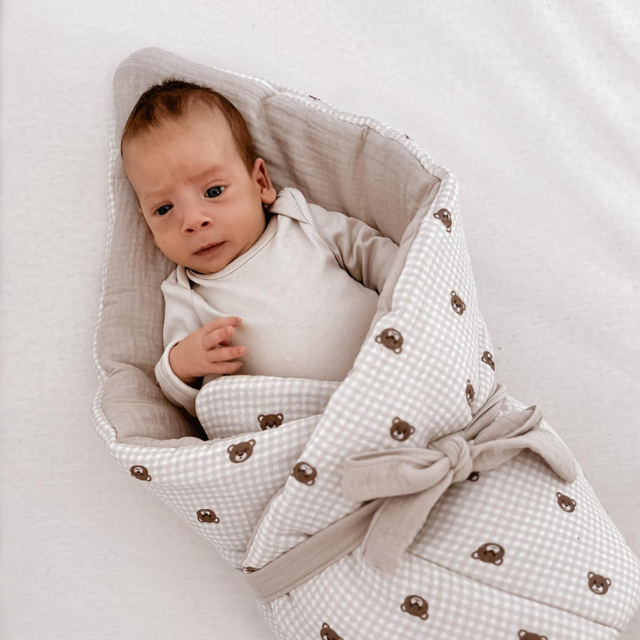 Rożek niemowlęcy muślinowy Misie i Kratka, środek i wiązanie beż