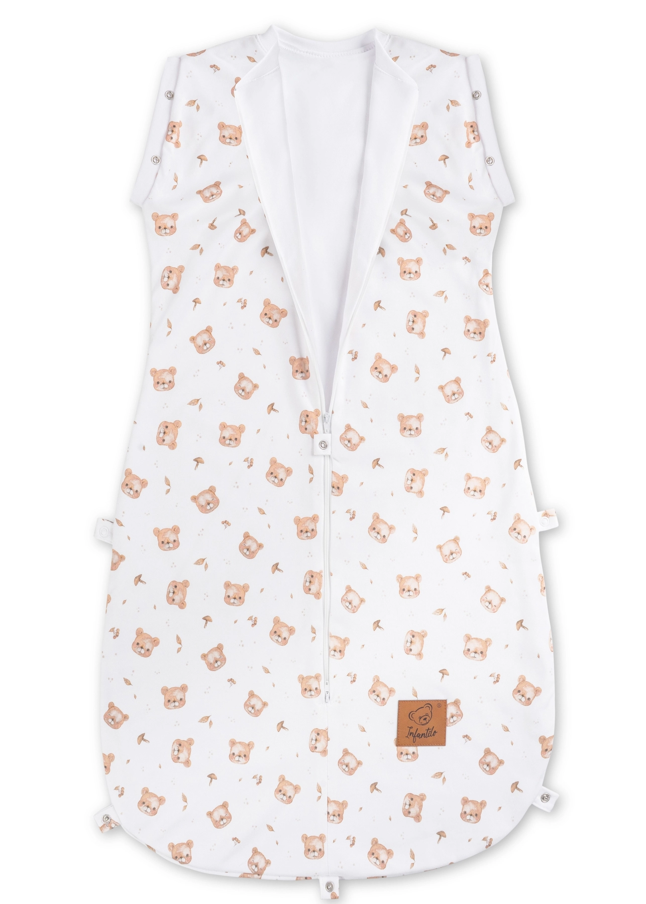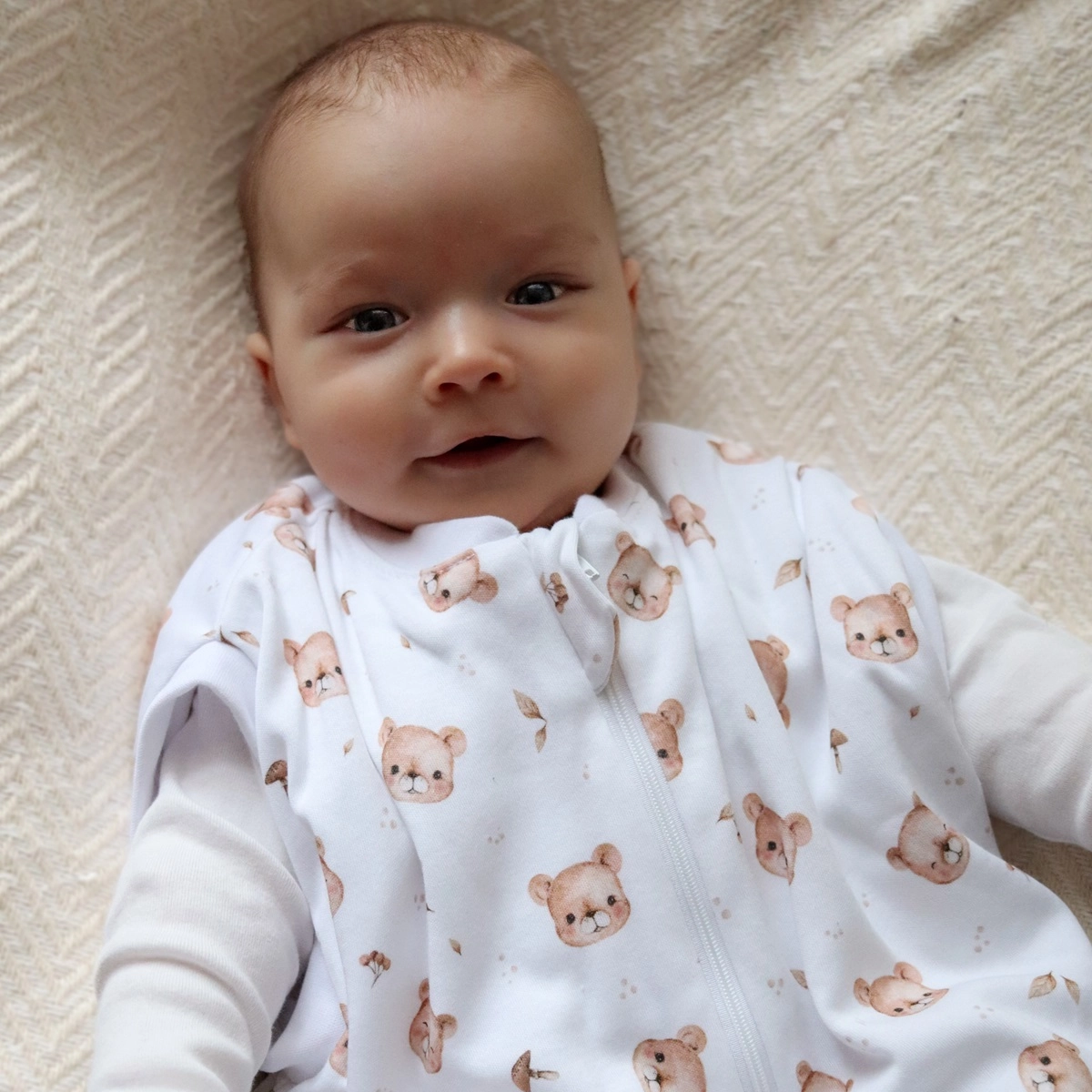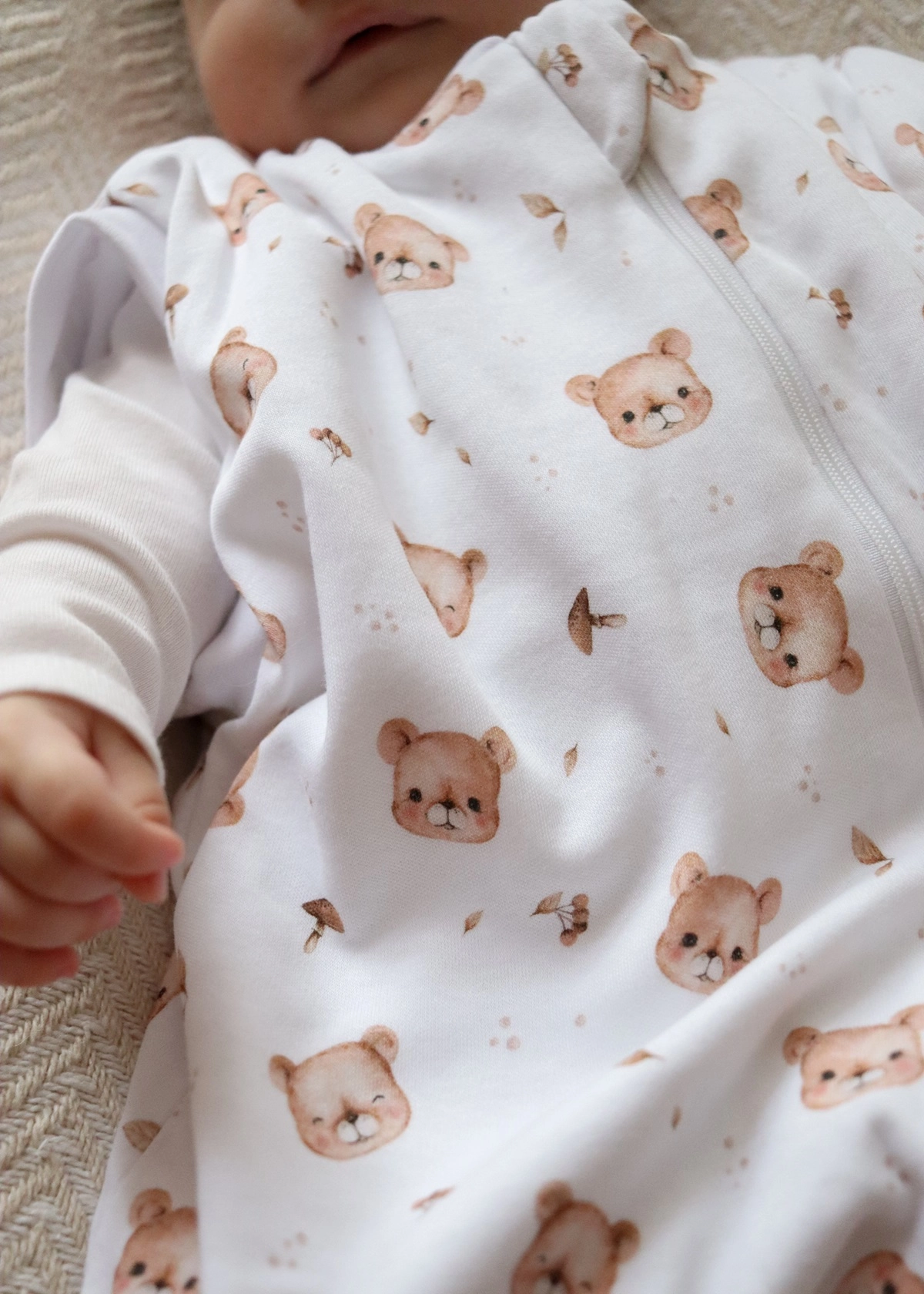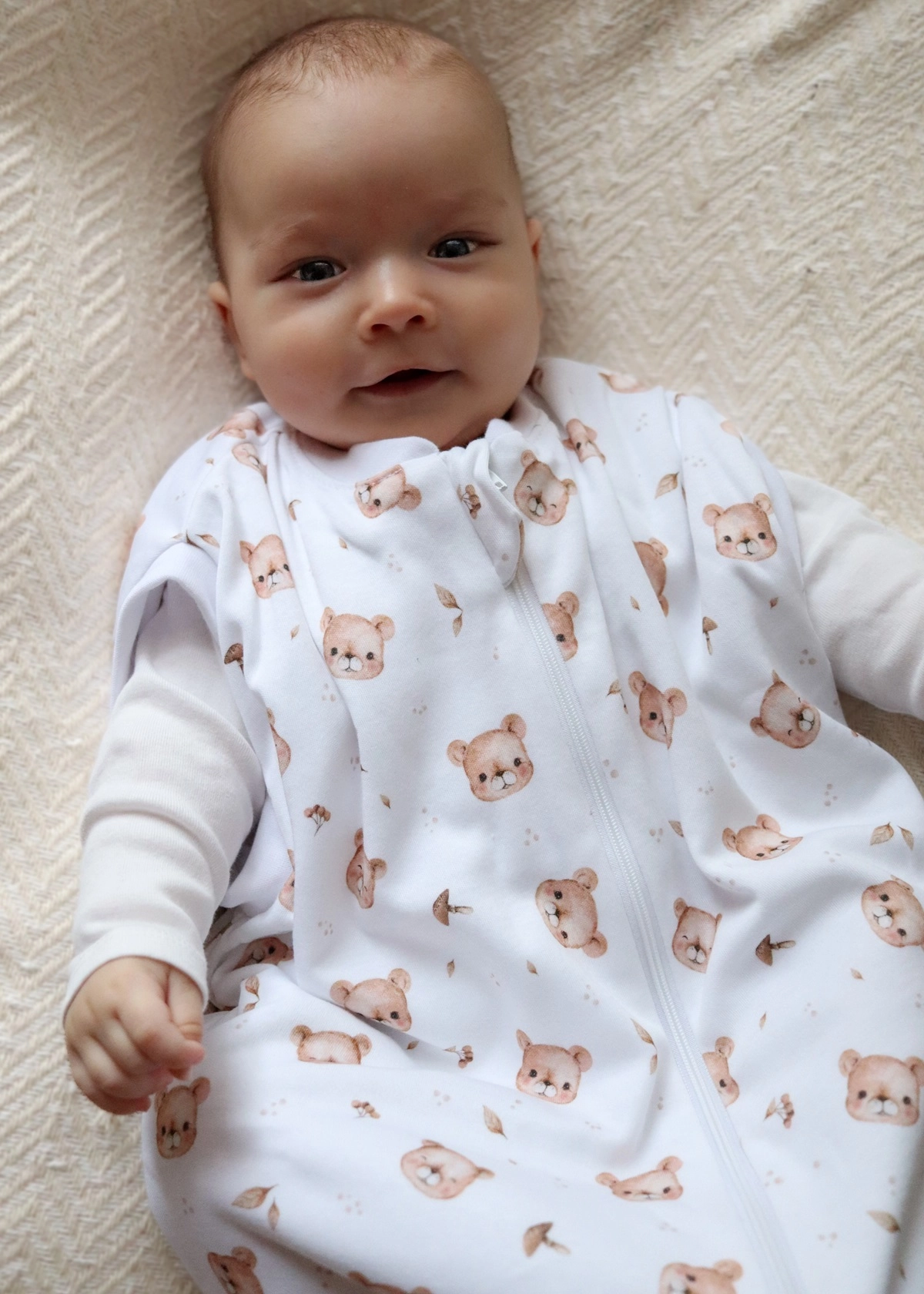 Idealny na cały rok – lekki, elastyczny i przyjemnie otulający, śpiworek utrzymuje optymalną temperaturę ciała dziecka bez ryzyka przegrzania. Śpiworek zasuwany jest na dwustronny suwak, z możliwością rozsunięcia od góry lub tylko od dołu, np. w celu zmiany pieluszki śpiącemu dziecku. Specjalny kształt śpiworka oraz zapięcie na napki w miejscu rączek dziecka pozwala na stworzenie otulacza, który zapewnia noworodkom poczucie bezpieczeństwa. Dzięki temu, że rączki dziecka znajdują się blisko ciała, zapobiega odruchowi Moro (to niekontrolowane ruchy rączkami, które wybudzają dziecko i wywołują płacz). W miarę rozwoju dziecka, w pierwszym etapie możemy rozpiąć tylko jeden “rękawek” tak, aby jedna rączka nadal pozostała schowana w śpiworku. Dzięki temu niemowlę stopniowo przyzwyczaja się do spania w wolnej przestrzeni.