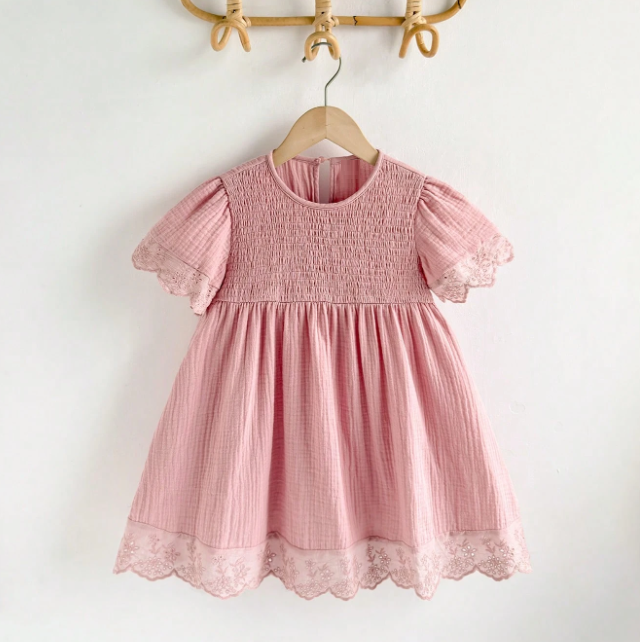 Sukienka letnia muślinowa z haftem i falbanką brudny róż NS