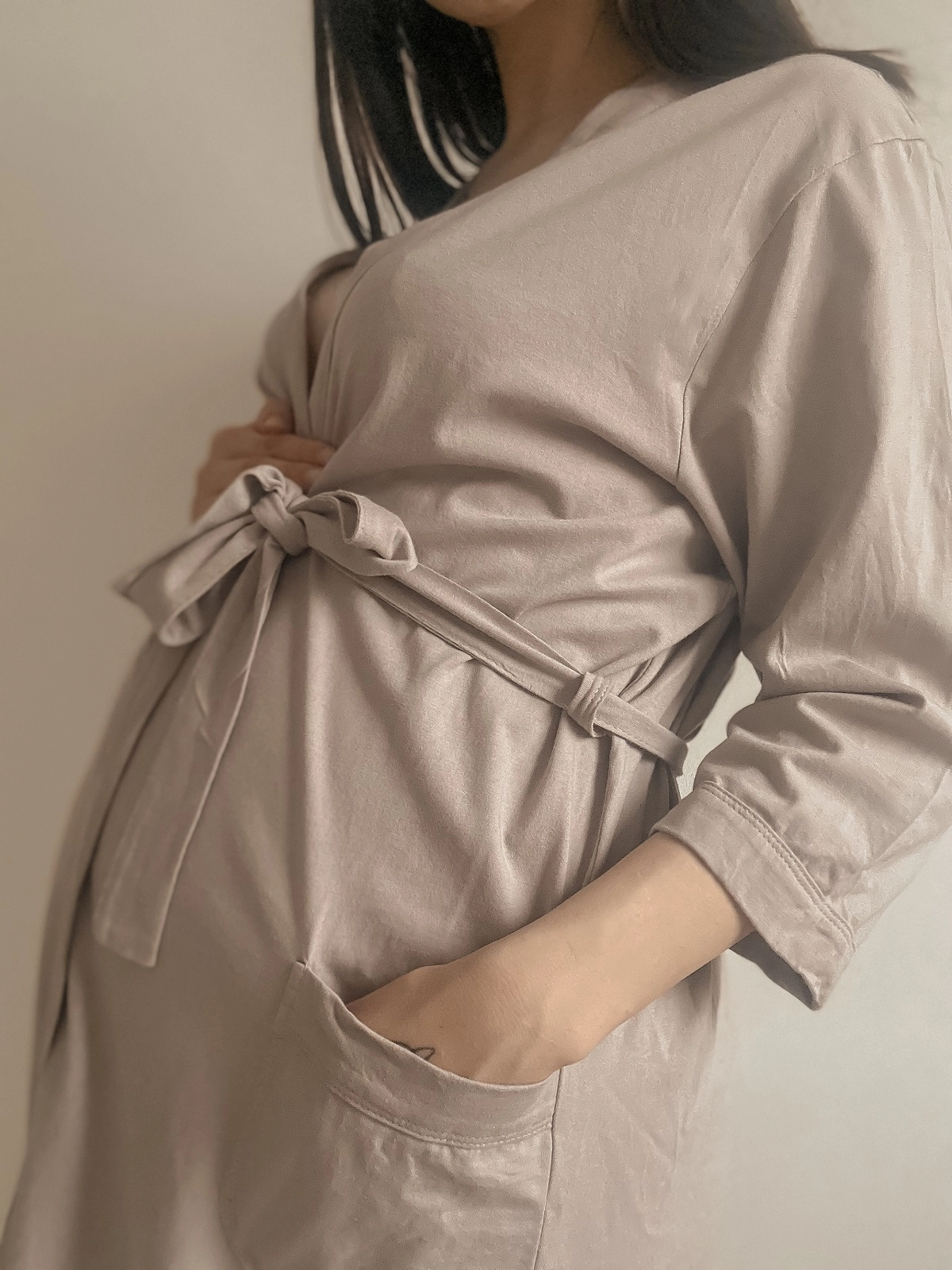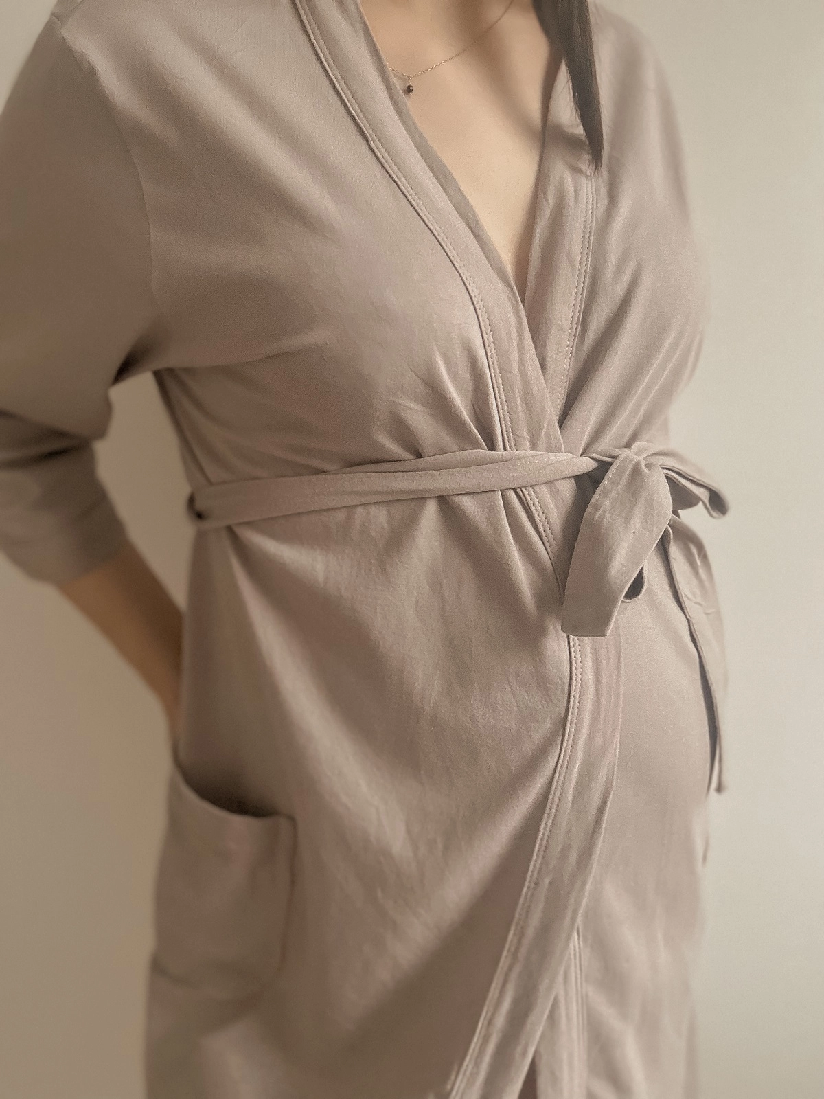 Kopertowy krój umożliwia dopasowanie obwodu i sprawia, ze szlafrok idealnie dopasowuje się do wciąż zmieniającej się sylwetki.
