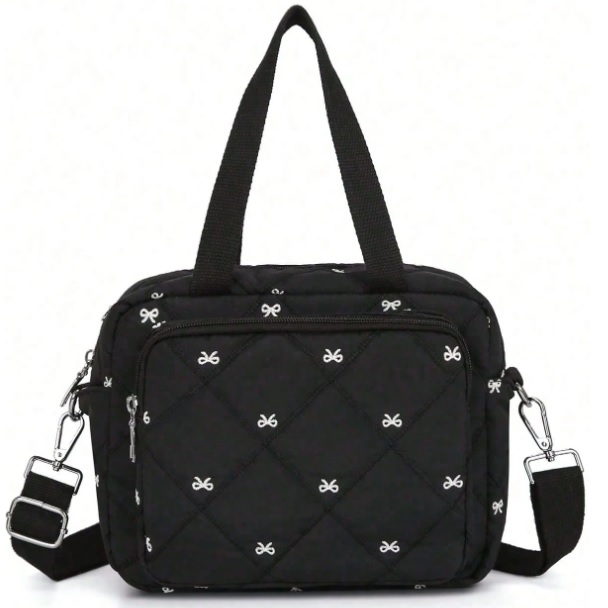 Torba pikowana w czarnym kolorze z białymi haftowanymi kokardkami