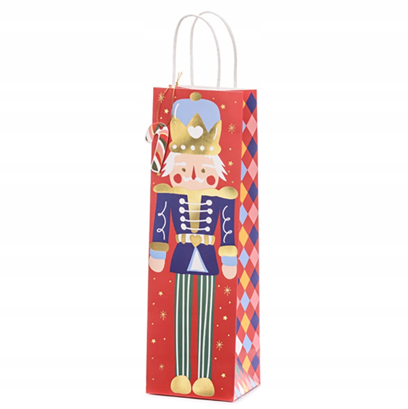 Papierowa torebka na prezenty Dziadek do orzechów w kolorze czerwonym ze złotym metalizowanym nadrukiem. Torba sprawdzi się idealnie jako opakowanie na prezent lub dekoracja pięknie wyglądająca pod choinką. Może zostać także wykorzystana jako ozdoba podczas Bożonarodzeniowej sesji zdjęciowej. Torebki papierowe dodadzą stylu i uroku umieszczonym w nich upominkom.