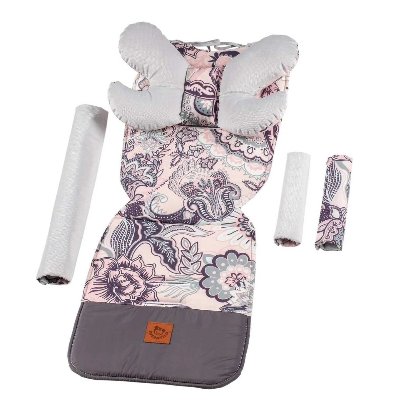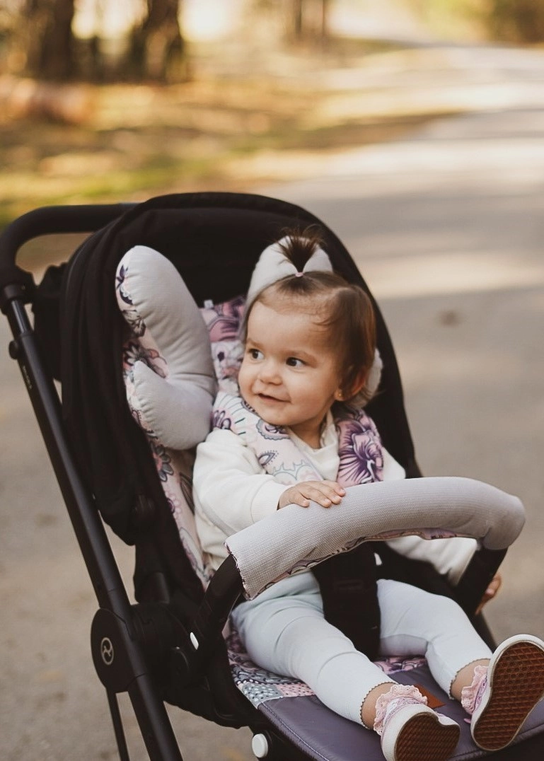 - Dwustronną wkładkę do spacerówki wyposażoną w troczki do przymocowania na wózku, co zapobiega jej zsuwaniu się.