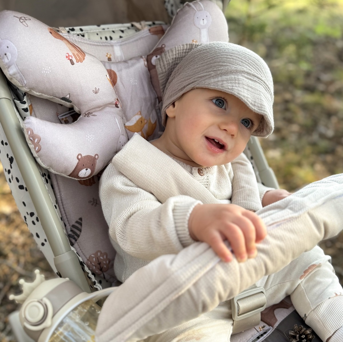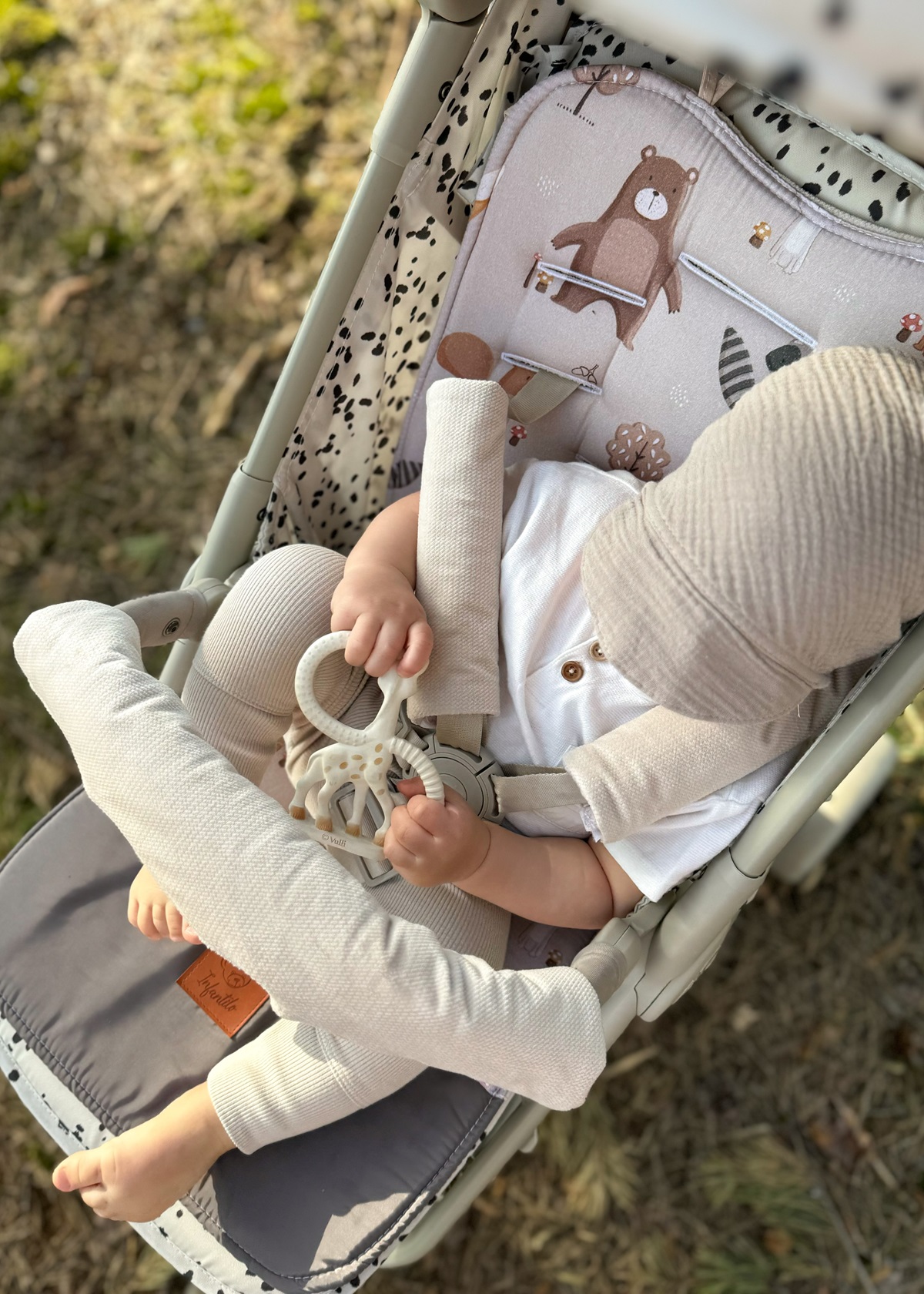- Dwustronną wkładkę do spacerówki wyposażoną w troczki do przymocowania na wózku, co zapobiega jej zsuwaniu się.
