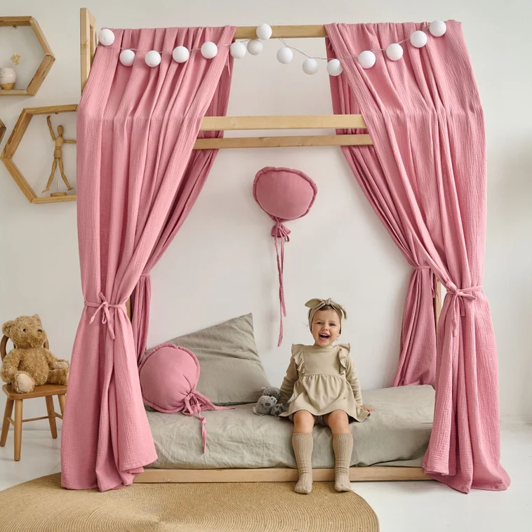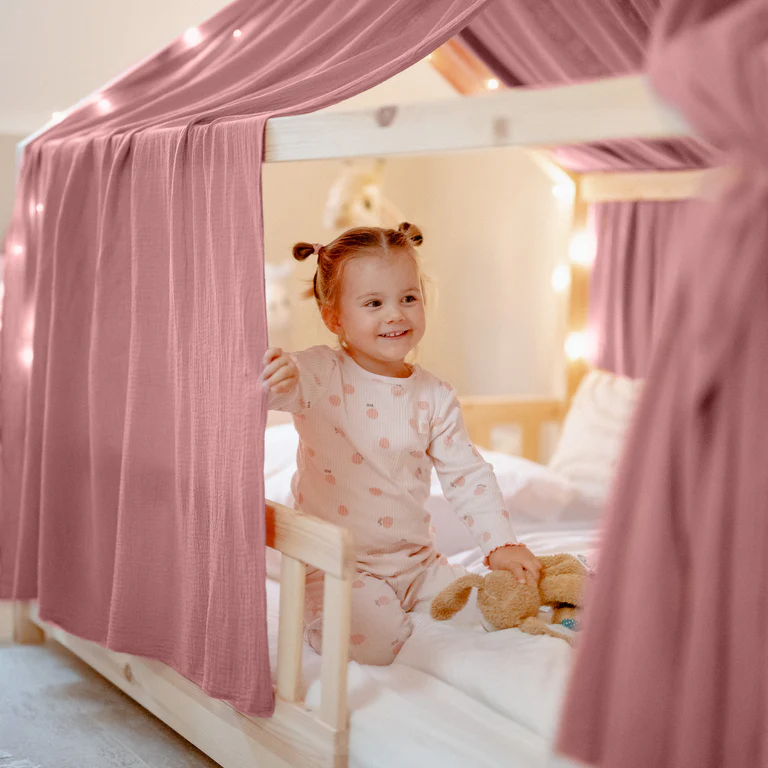 Dodaj odrobinę magii i ciepła do pokoju swojego dziecka z naszymi zasłonkami muślinowymi do łóżeczek domków.