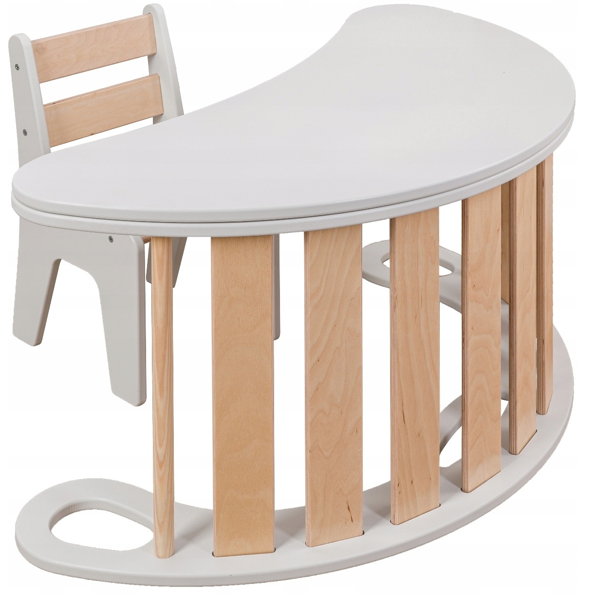 Blat w połączeniu z bujakiem montessori może służyć jako STOLICZEK, BIURKO – jest to doskonała forma zabawy gdyż dzięki funkcji 3w1 jest to zarówno plac zabaw jak i miejsce do nauki i rozwijania umiejętności plastycznych.
