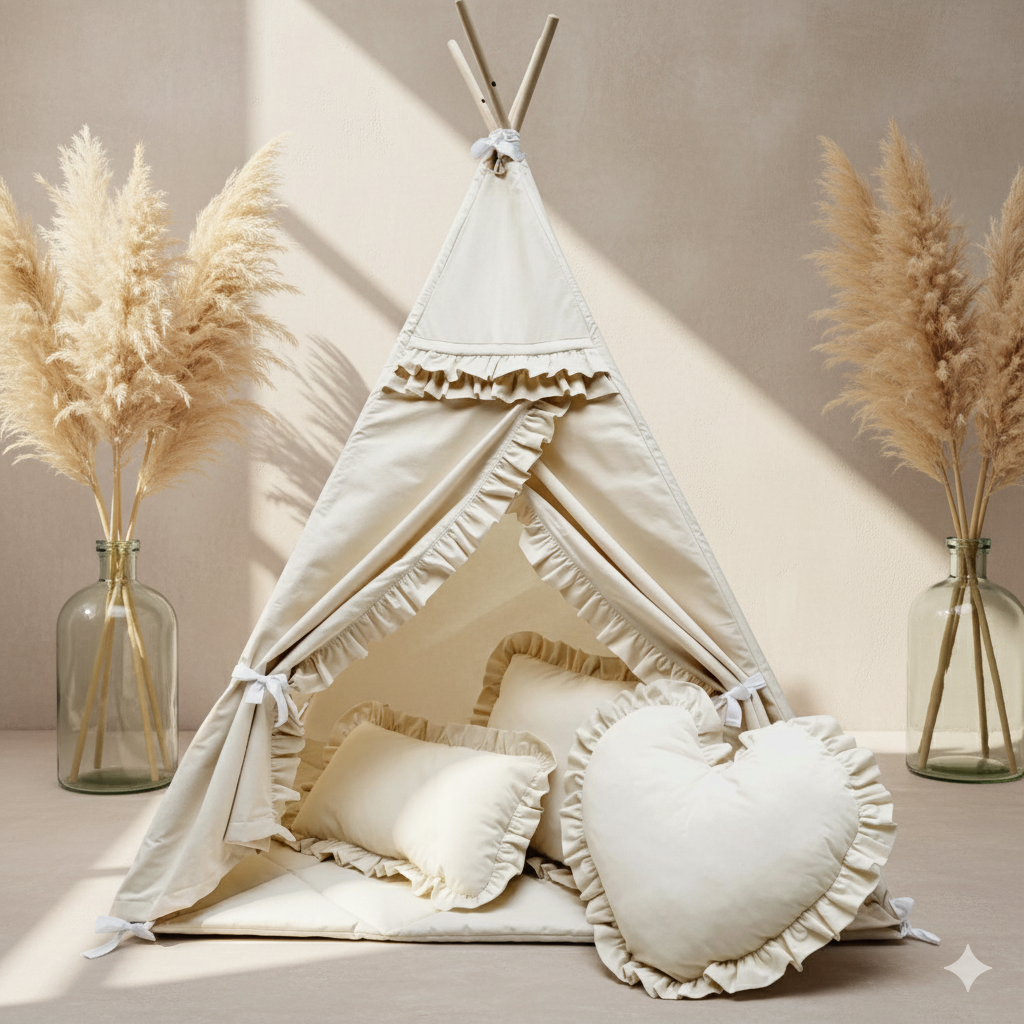 Trzy Urocze Poduszki Ozdobne: Wzbogać wystrój i komfort namiotu za pomocą trzech miękkich poduszek w kształtach: serca (40 cm), prostokąta (30×50 cm) i kwadratu (40×40 cm). Poduszki mierzone są bez falbanek, dodając uroku wnętrzu.