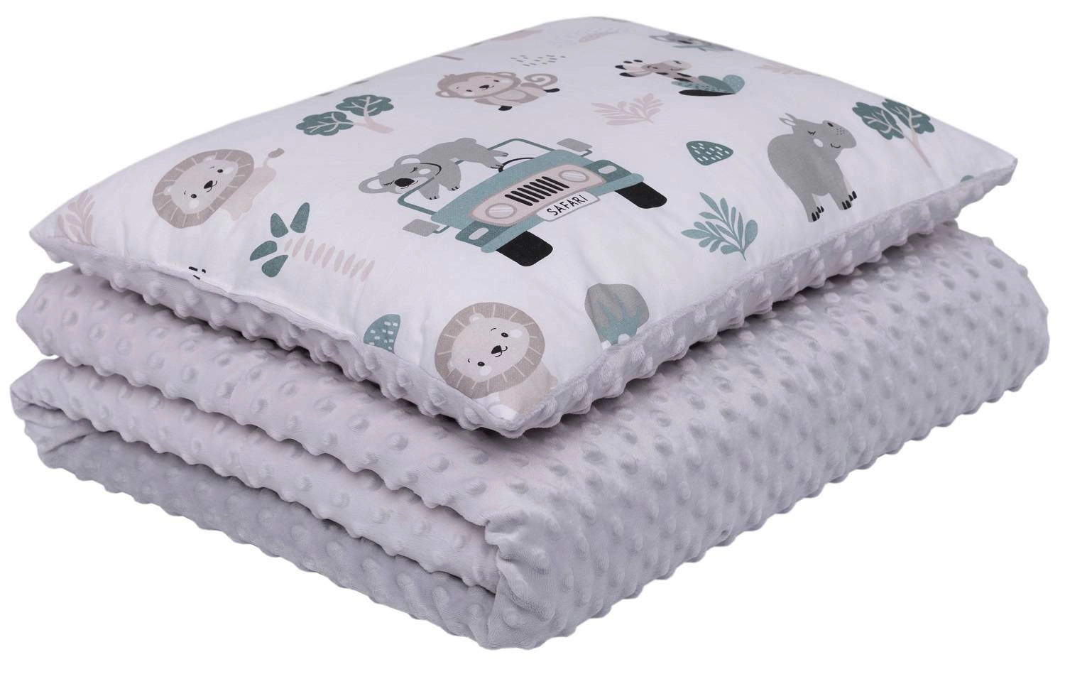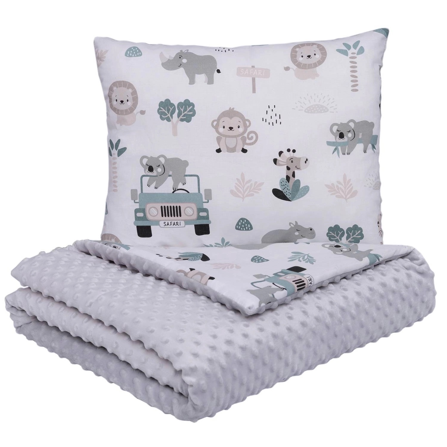 Nasz komplet pościelowy to idealne połączenie elegancji, funkcjonalności i bezpieczeństwa. Składa się z dużego, mięciutkiego kocyka oraz puchatej poduszki, które razem stworzą przytulne miejsce do snu i odpoczynku dla Twojego maluszka.