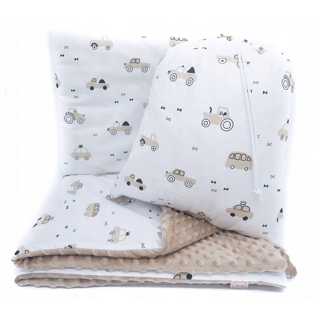 Zestaw przedszkolaka samochody na bieli i beżowe minky al