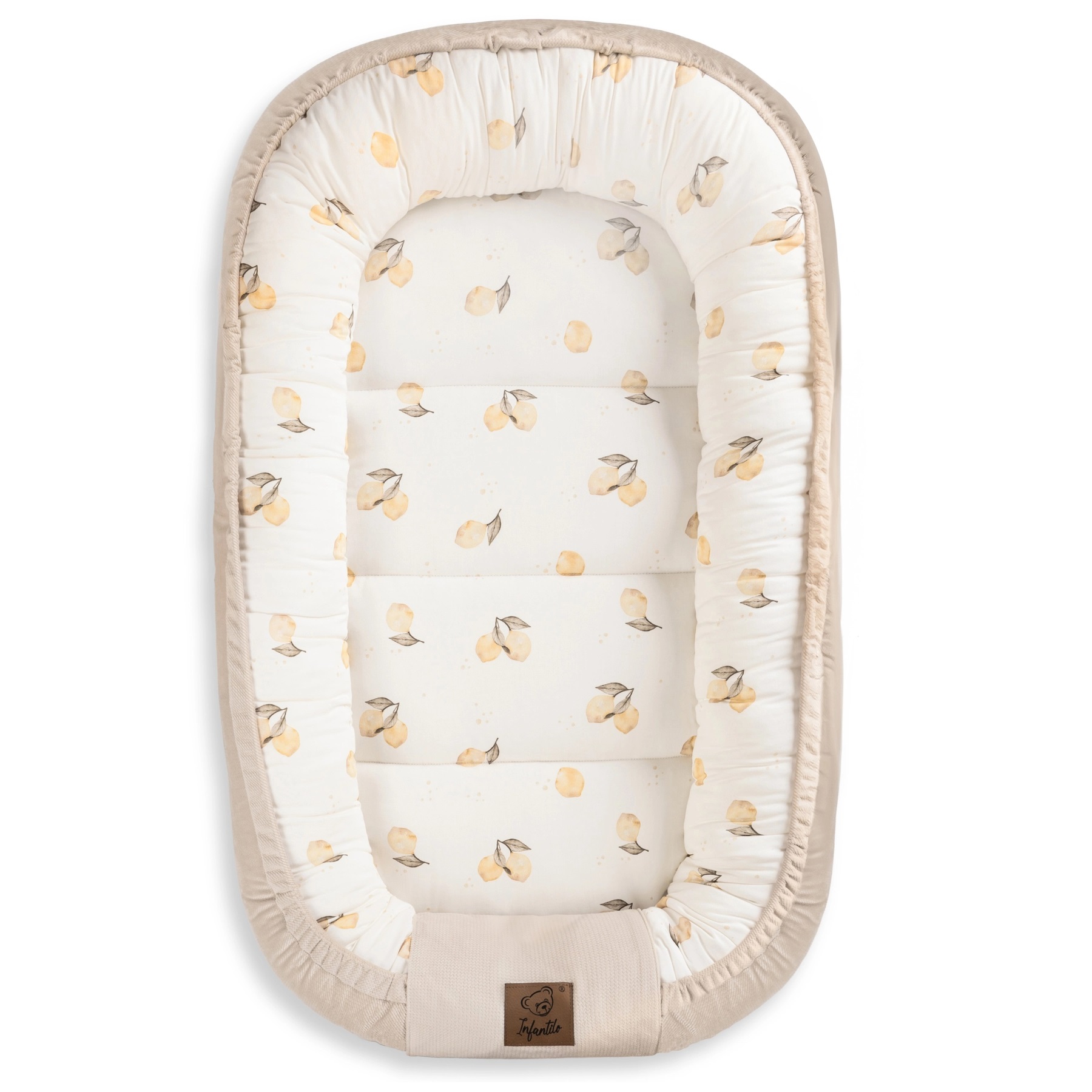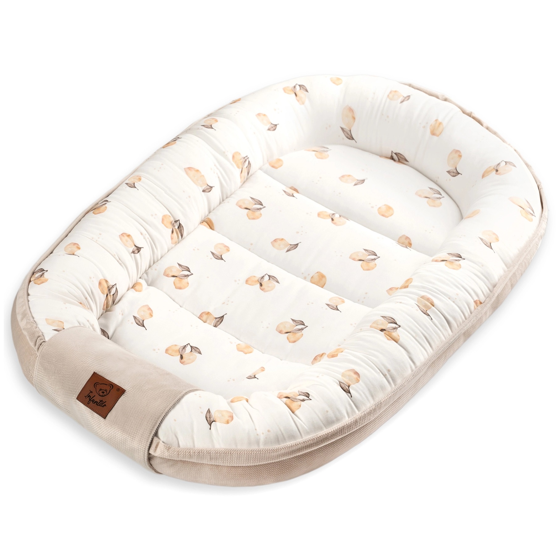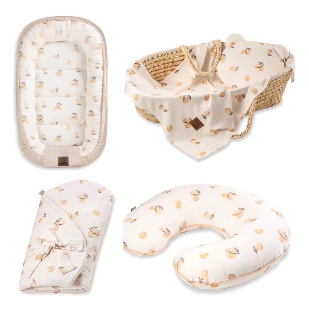 Poszycie: 100% bawełna – miękka i przyjazna dla skóry dziecka (wzór Cytrynki), welwet beżowy w kokonie (100% poliester)