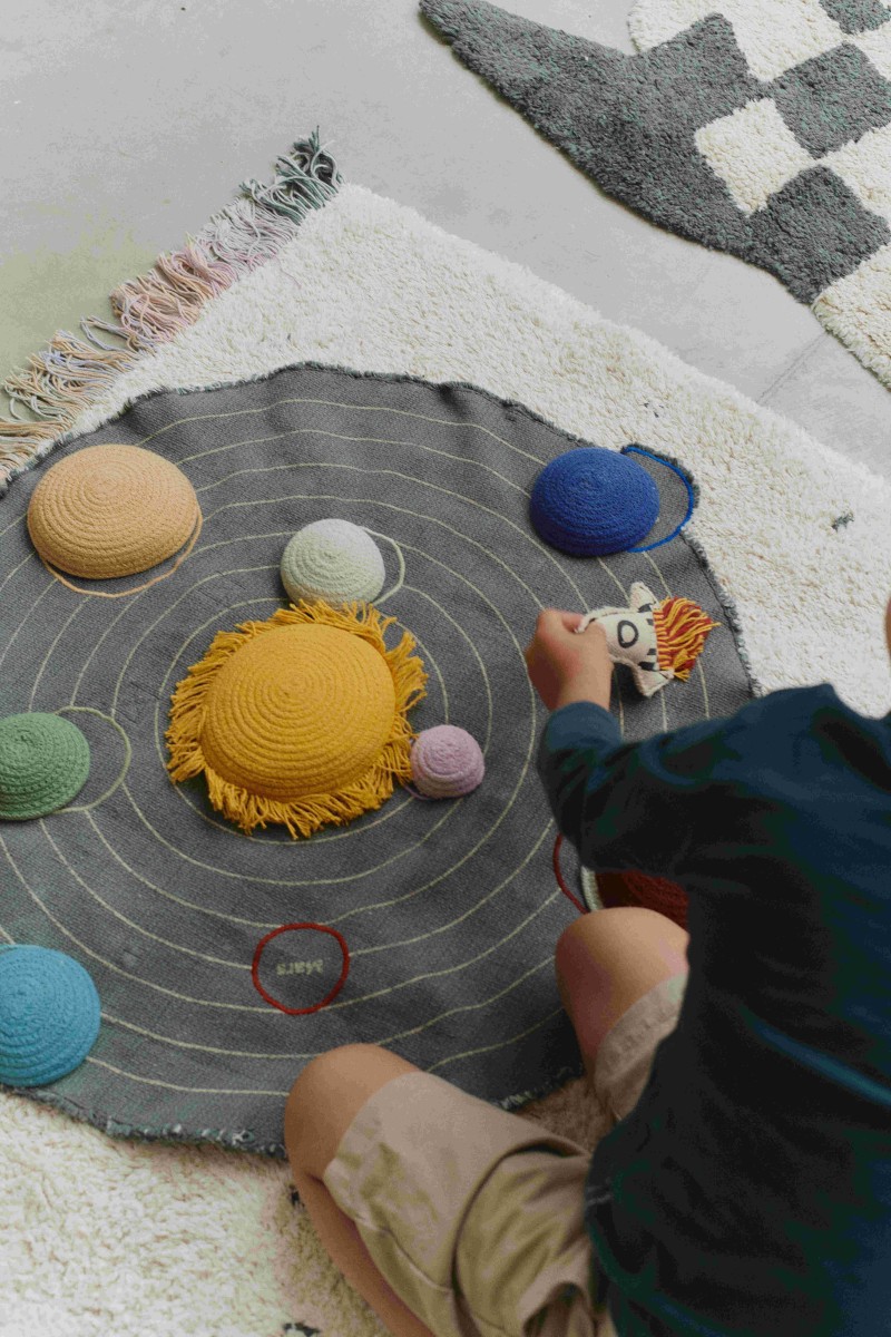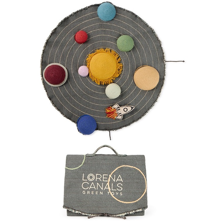 Zestaw zawiera planety z plecionego bawełnianego sznurka, które można umieścić na ich właściwych orbitach oraz mini tekstylną rakietę dla dodatkowej zabawy, gdy dzieci podróżują z jednej planety na drugą. Po zakończeniu zabawy wystarczy umieścić wszystkie elementy wewnątrz, złożyć płótno w walizkę i zabezpieczyć cienkimi sznurkami. Wbudowany uchwyt ułatwia dzieciom przenoszenie przygody z Układem Słonecznym w dowolne miejsce.